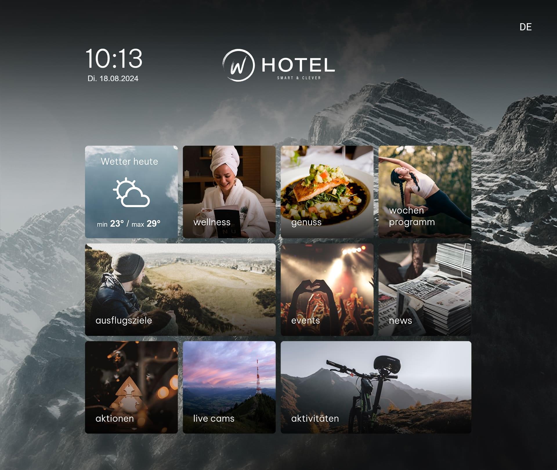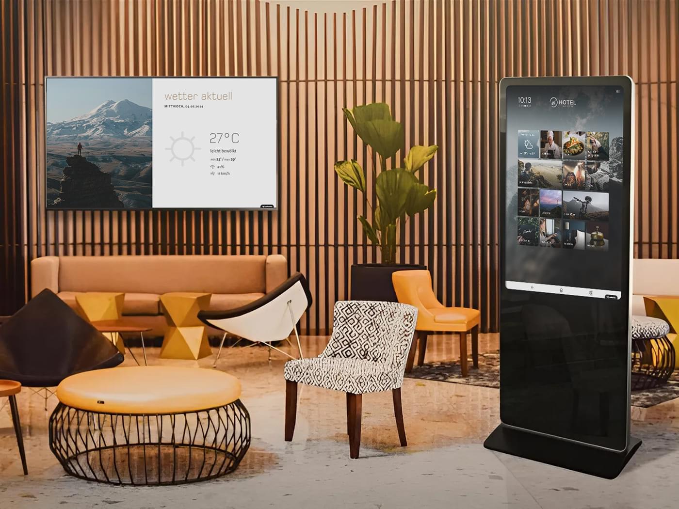 Oder du entscheidest dich für eine Version ohne Touchsteuerung und spielst Inhalte mittels animierter Slideshow beispielsweise in der Lobby oder im eigenen Hotel TV ab.